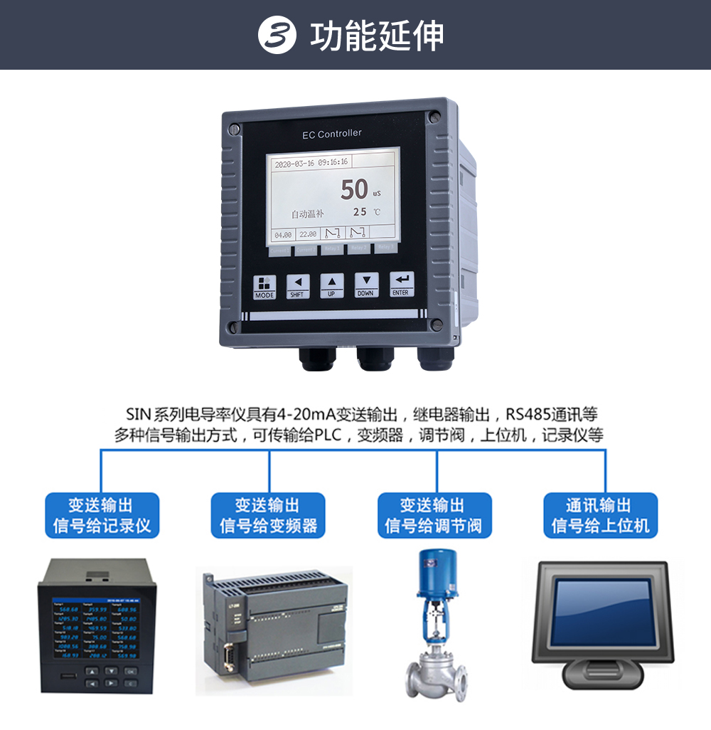 聯測儀表SIN-EC8.0用于工業上電導/比電阻/鹽度/溶解固體總量及溫度的測量,如: 廢水,純凈水,環境監測,食品生產過程等,儀器可以盤面安 裝,壁掛安裝,管路安裝。儀器提供 2 路電流輸出,最大負載為 500Ω, 儀器提供 3 路控制用繼電器,繼電器最大承受電壓及電流為 5A/250VAC 或 5A/30VDC。